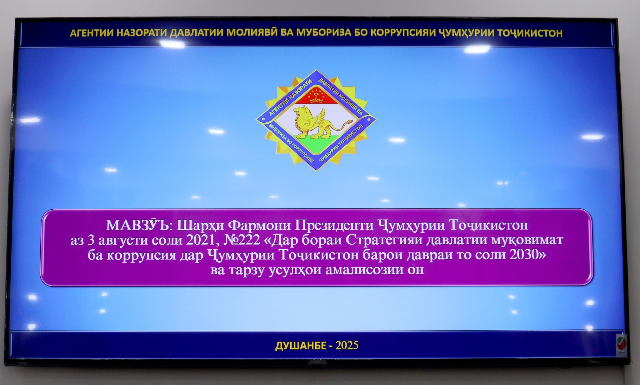Дар вохурӣ кормандони раёсати муқовимат бо коррупсияи Агентии назорати давлатии молия ва мубориза бо коррупсияи Ҷумҳурии Тоҷикистон, Фармони Президенти Ҷумҳурии Тоҷикистон аз 3-августи соли 2021, № 222 “Дар бораи Стратегияи давлатии муқовимат ба коррупсия дар Ҷумҳурии Тоҷикистон барои давраи то соли 2030” ва тарзу усулҳои амалисозии онро баррасӣ намуданд.
